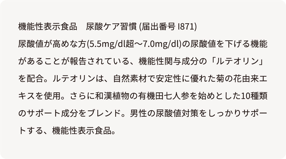 高めの尿酸値(※5.5mg/dl超〜7.0mg/dl未満)を下げる、機能性関与成分のルテオリンを配合。