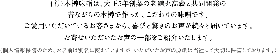 信州木樽味噌は、大正5年創業の老舗丸高蔵と共同開発の昔ながらの木樽で作った、こだわりの味噌です。ご愛用いただいているお客さまから、喜びと驚きのお声が続々と届いています。お寄せいただいたお声の一部をご紹介いたします。