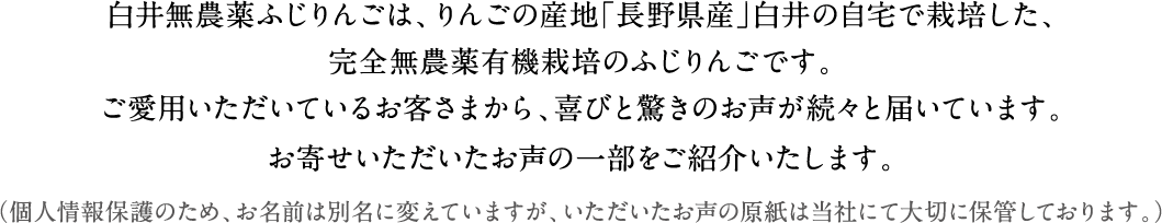 白井無農薬ふじりんごは、りんごの産地「長野県産」白井の自宅で栽培した、完全無農薬有機栽培のふじりんごです。ご愛用いただいているお客さまから、喜びと驚きのお声が続々と届いています。お寄せいただいたお声の一部をご紹介いたします。