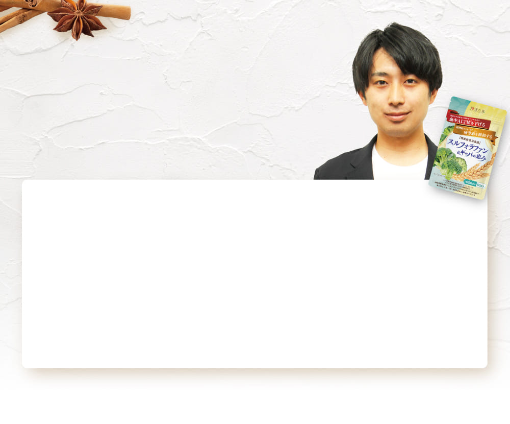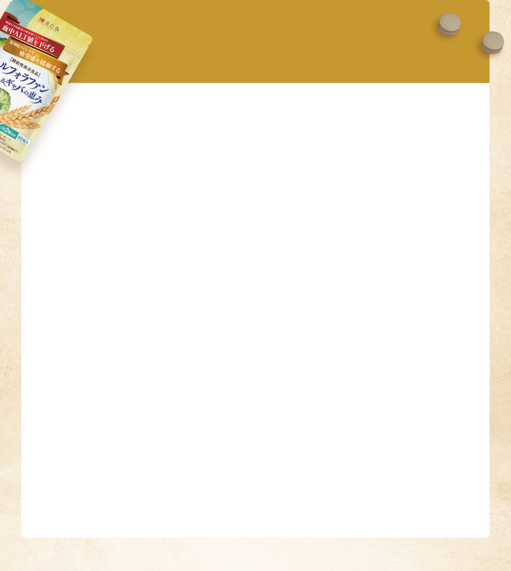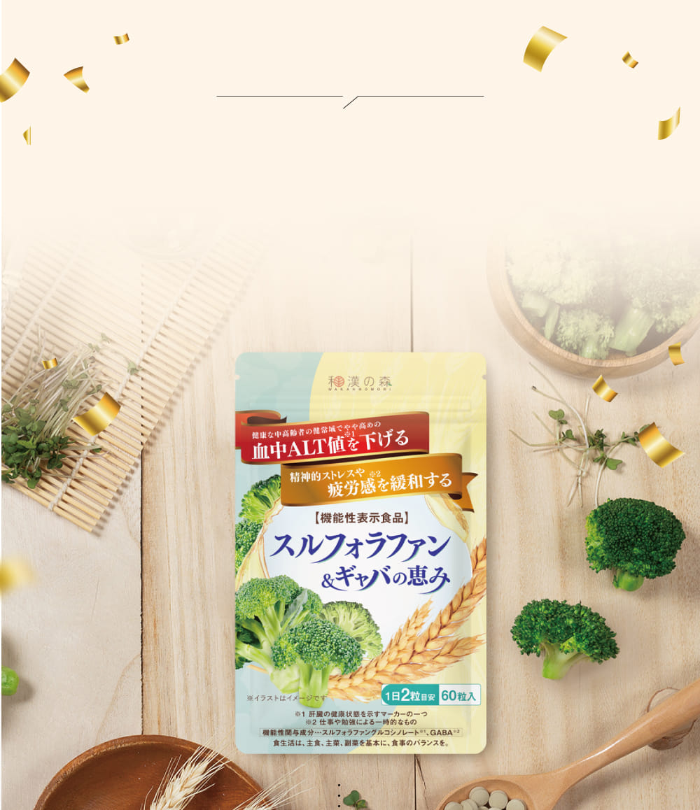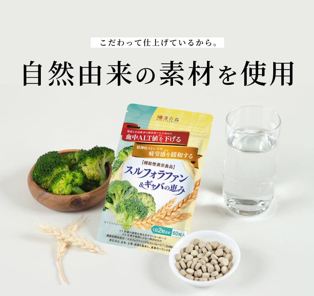 - 本品にはスルフォラファングルコシノレート、GABAが含まれます。スルフォラファングルコシノレートには、健康な中高齢者の健常域でやや高めの血中ALT値(肝臓の健康状態を示すマーカー)を下げることが報告されています。GABAには、睡眠の質(深い眠りや目覚めのよさ)の向上に役立つ機能、仕事や勉強による一時的な精神的ストレスや疲労感を緩和する機能、高めの血圧を低下させる機能があることが報告されています。