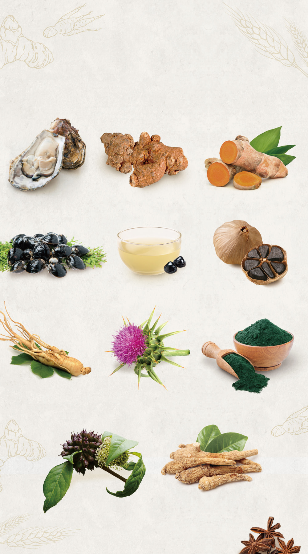 - ブロッコリー種子エキス末(ブロッコリー抽出物、でん粉分解物)(中国製造)、γ-アミノ酪酸、マルチトール、大麦乳酸発酵液ギャバ、田七人参末、西洋人参エキス末、マリアアザミエキス末、オタネニンジンエキス末、L-オルニチン塩酸塩、ウコンエキス末、マカ末、発酵黒ニンニク末、しじみエキス末、クロレラ末、牡蠣エキス末、エゾウコギ末/セルロース、V.B1、V.B6、HPC、ステアリン酸Mg、CMC、微粒酸化ケイ素